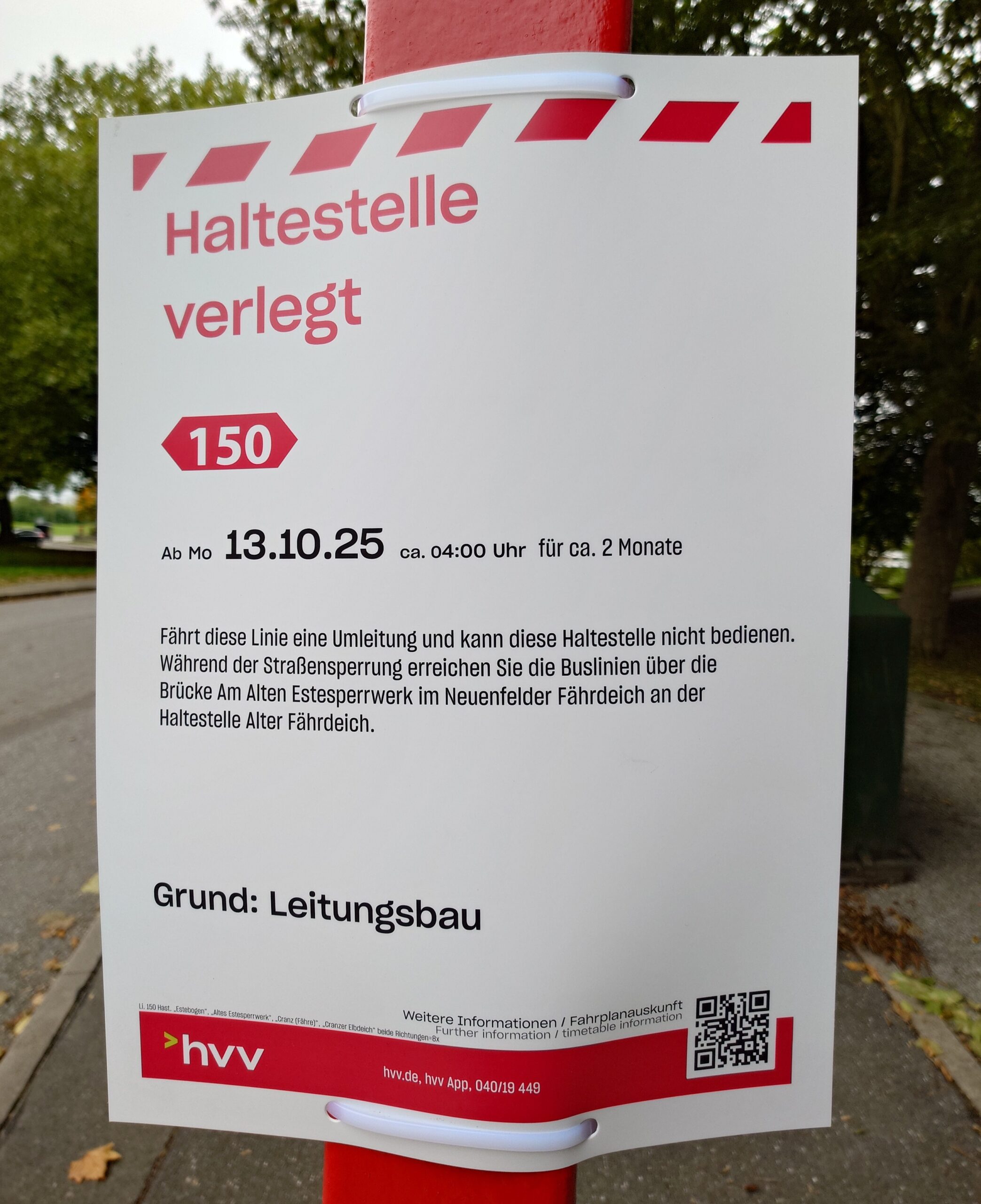Auch der Busverkehr ist betroffen. Die Haltestellen Cranz (Fähre), Altes Estesperrwerk und Estebogen werden von den Linien 150 und 257 nicht bedient.